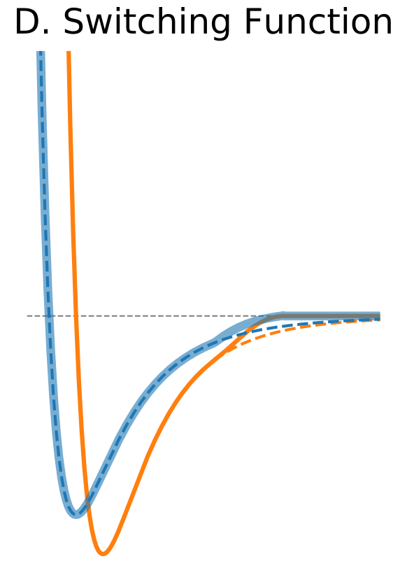 We have learned that the LJ potential is always truncated at the cutoff distance. A cutoff introduces a discontinuity in the potential energy at the cutoff value. As forces are computed by differentiating potential, a sharp difference in potential may result in nearly infinite forces at the cutoff distance (Figure 1A). There are several approaches to minimize the impact of the cutoff.